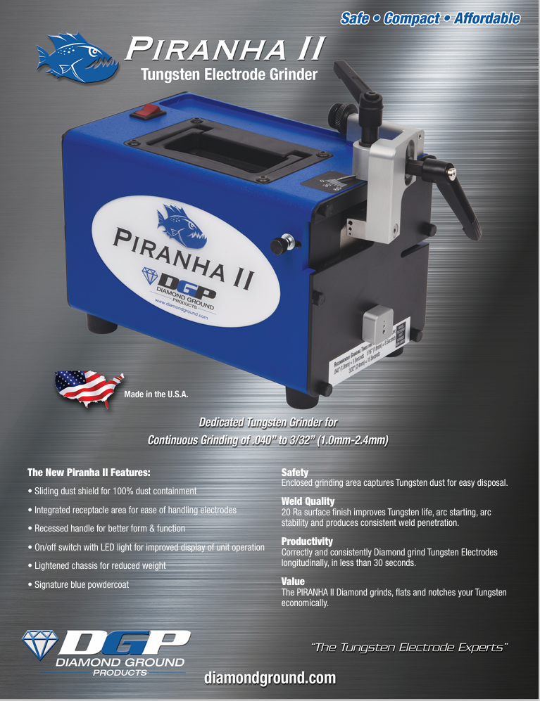Tungsten Grinder Piranha DGP-PG2-A Tungsten Electrode Sharpening Enclosed Grinding Area 100% Dust Containment for Safe DisposalAnother Great Product "Made in the USA"DGP-PG2-A Piranha 2-A Tungsten Grinder can improve weldingproductivity by correctly and consistently sharpening